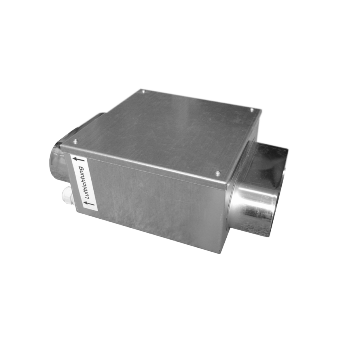 Die schallgedämmte Ventilatorbox EC 200 besteht aus einem feuerverzinkten Metallkasten mit abnehmbarem Deckel und beidseitigem, ovalem Anschlussstutzen mit Nennweite 191×79 mm. Das laufruhige und druckstarke EC-Radialgebläse mit Lüfterrad aus sendzimierverzinktem Stahlblech wird über einen 0-10 VDC Eingang angesteuert. Der Elektroanschluss wird über 2 schraublose Netzklemmen/Stecker, getrennt für Steuerspannung (0-10 VDC) und Netzspannung (230 VAC/50Hz), hergestellt.