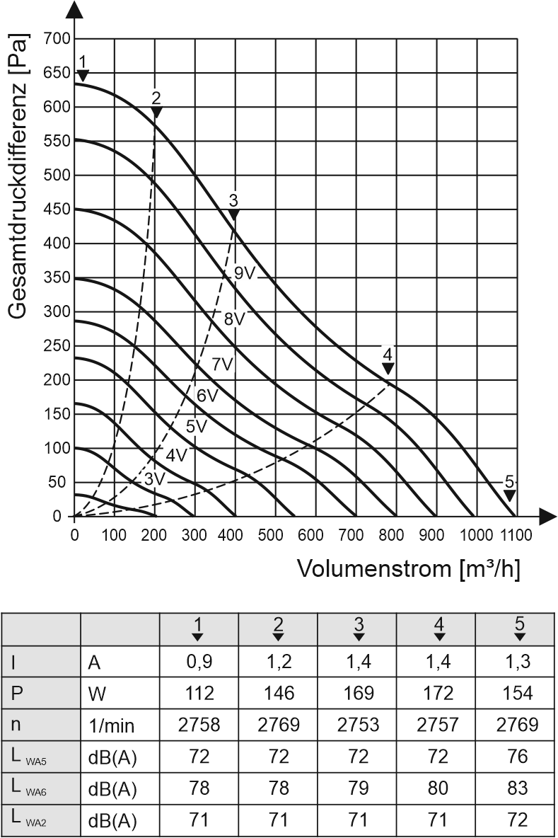 Förderleistung, freiblasend (Vmax): 1.100 m³/h (bei 10VDC)