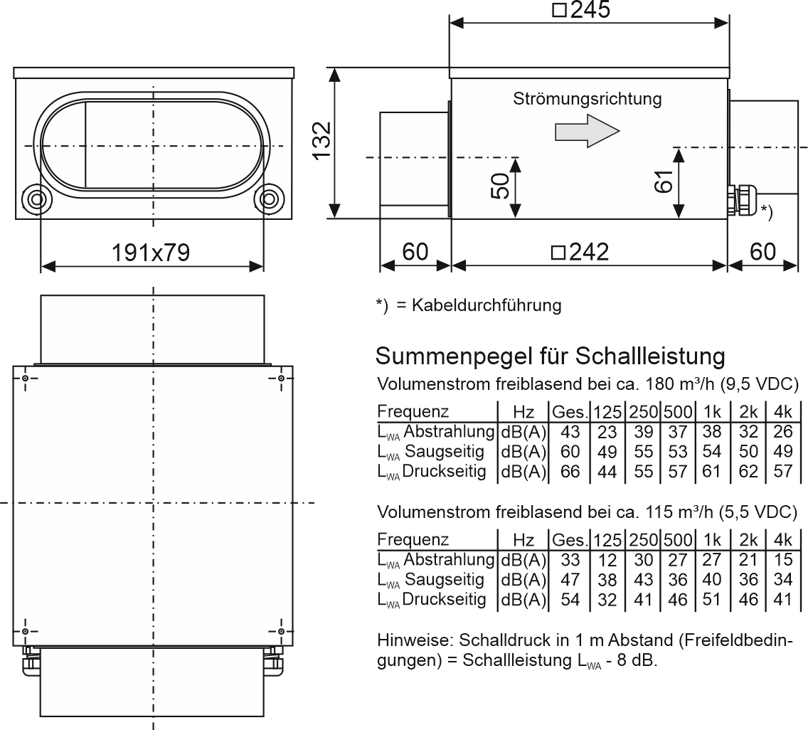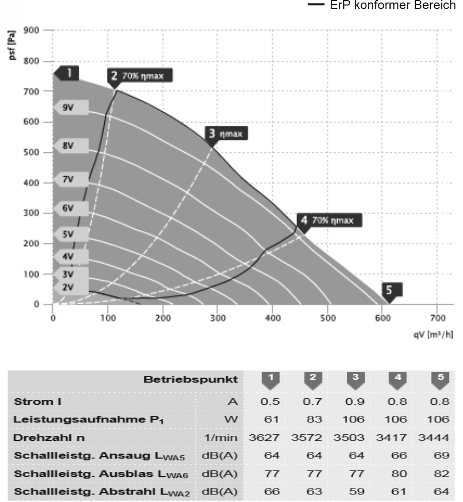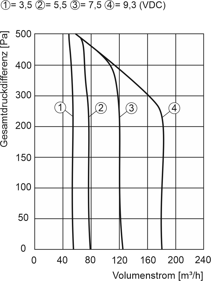 Förderleistung, freiblasend (Vmax): 450 m3/h (bei 10VDC)