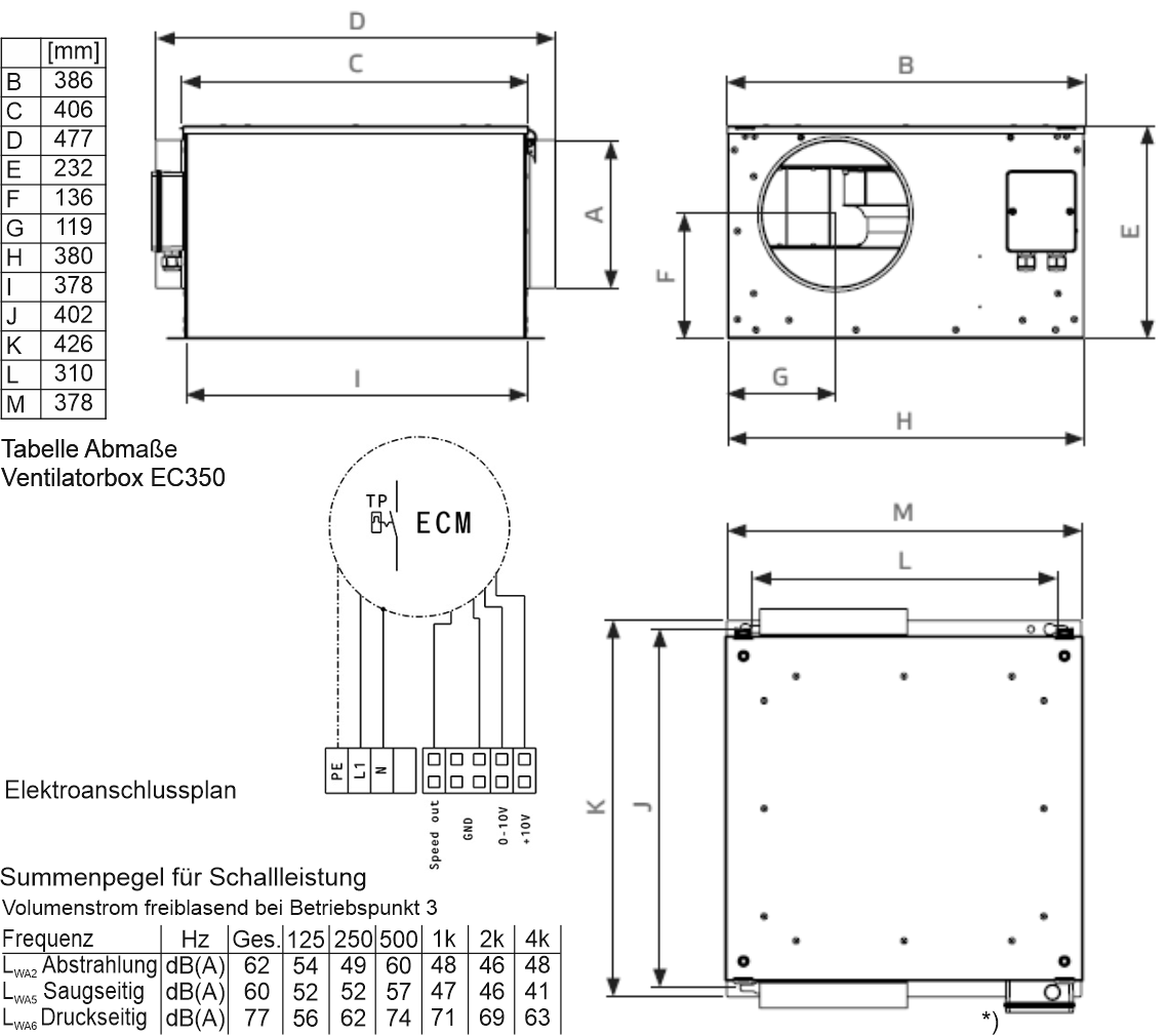 Die schallgedämmte Ventilatorbox EC350 besteht aus einem feuerverzinkten Metallkasten mit schallabsorbierender Innenauskleidung (35 mm Mineralwolle mit Glasseidekaschierung), ausschwenkbarem Deckel sowie beidseitigem Anschlussstutzen (Anordnung: inline). Das rückwärts gekrümmte EC-Radialgebläse mit integriertem Überlastungsschutz wird über einen 0-10 VDC Eingang angesteuert. Der Elektroanschluss für die Versorgungs- und Steuerspannung befindet sich an der Gehäuseaußenseite.