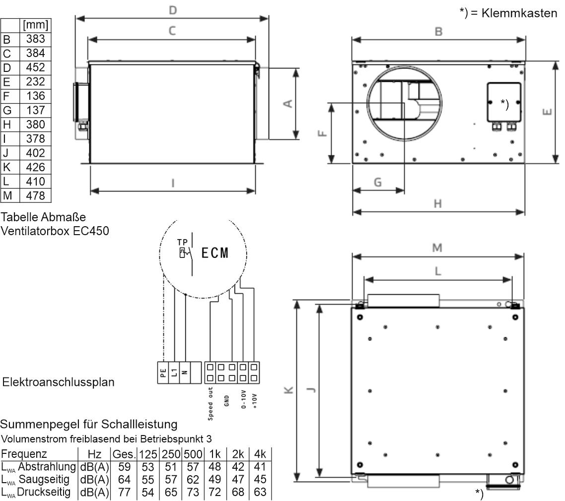 Die schallgedämmte Ventilatorbox EC450 besteht aus einem feuerverzinkten Metallkasten mit schallabsorbierender Innenauskleidung (35 mm Mineralwolle mit Glasseidekaschierung), ausschwenkbarem Deckel sowie beidseitigem Anschlussstutzen (Anordnung: inline). Das rückwärts gekrümmte EC-Radialgebläse mit integriertem Überlastungsschutz wird über einen 0-10 VDC Eingang angesteuert. Der Elektroanschluss für die Versorgungs- und Steuerspannung befindet sich an der Gehäuseaußenseite.