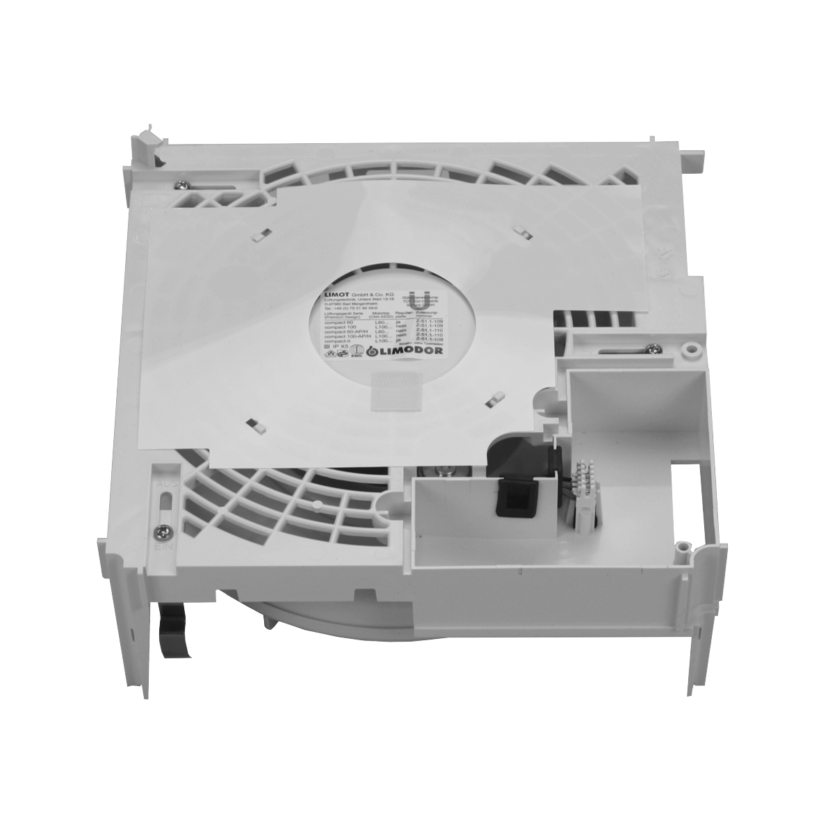 Gebläsemotor für alle Lüfterserien compact mit Gehäuse, Regulierplatte und Rastfedern.