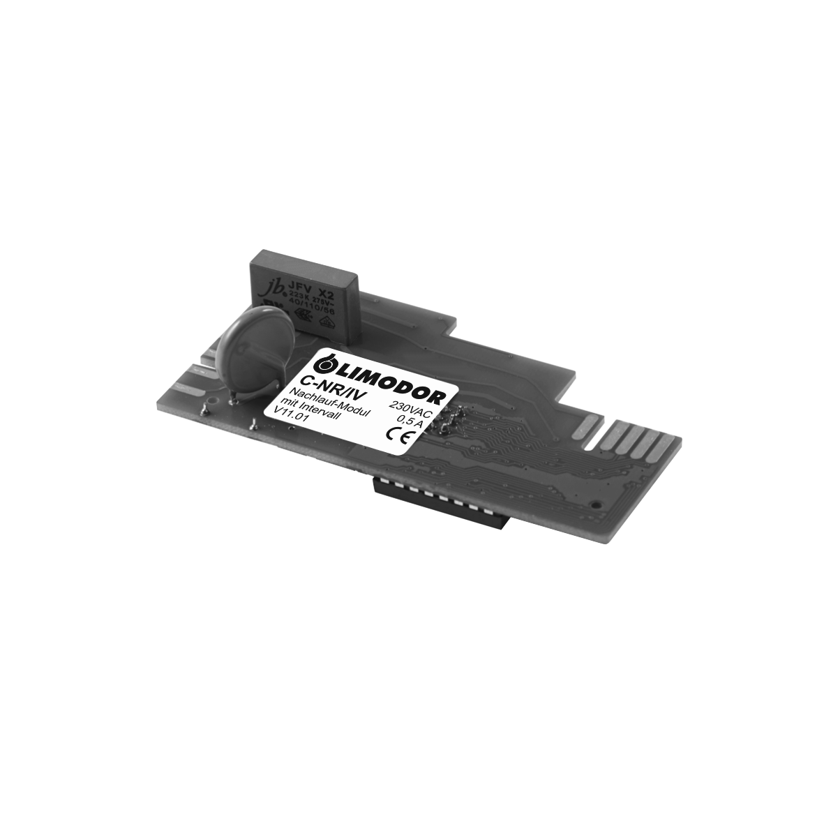 Steckbares Nachlauf- und Intervallmodul mit Rückstellfunktion zur Montage am Leistungsteil/Motorsteuerung des Gebläses. Einstellung der Nachlauf-/ Einschaltverzögerungszeit und Inversbetrieb durch DIP-Schalter. Das Nachlaufmodul verfügt über einen Steckplatz zur Aufnahme des Zusatzmoduls (z.B.: Feuchteregler Serie C-FR (Version: 4)). Werkseitige Voreinstellung der DIP-Schalter: Nachlaufzeit 16 Min., ohne Einschaltverzögerung und Inversbetrieb. (Hinweis: Der Inversbetrieb kann nur mit einem 2-stufigen Gebläse compact verwendet werden).